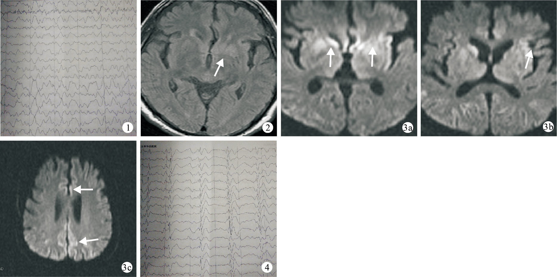 腦電圖雙側彌漫性慢波,病程2+個月 ? ?圖 2 頭部FLAIR像左側基底節區高信號影(白箭),病程1+個月 ? ? 圖 3頭部DWI像雙側基底節區(3a)、額顳頂枕島葉皮層(3b、3c)多發高信號影(白箭),病程2+個月 ? ? 圖 4腦電圖周期性三相波,病程4+個月