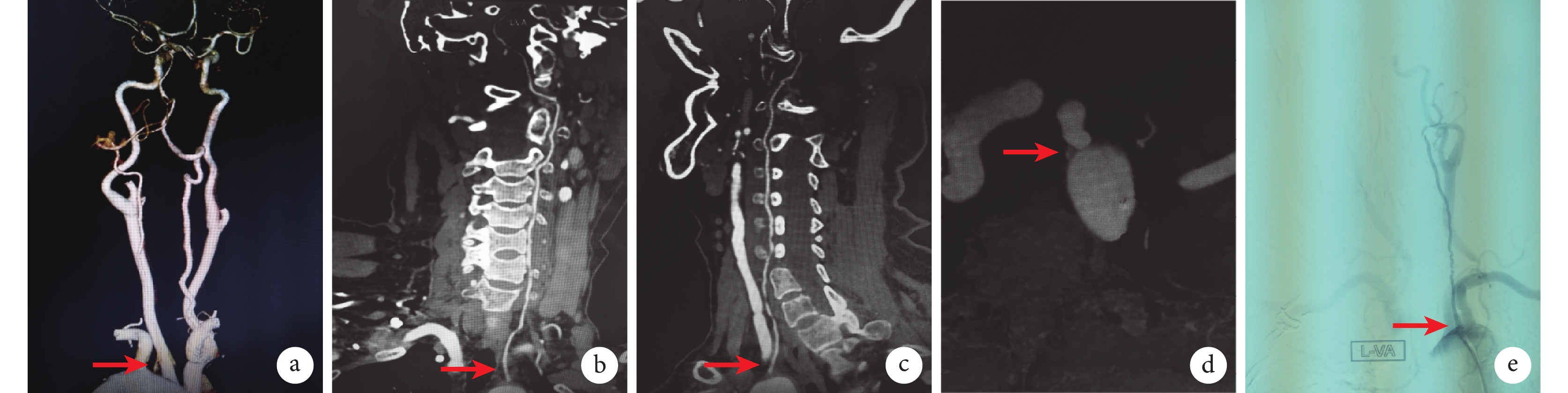 a~d:分別為CTA三維重建(a)、冠狀位(b)、矢狀位(c)及軸位(d)掃描結果,左椎動脈起始部重度狹窄并異位起源于主動脈弓 (紅色箭頭);e:數字減影血管造影顯示左椎動脈支架置入情況(紅色箭頭)