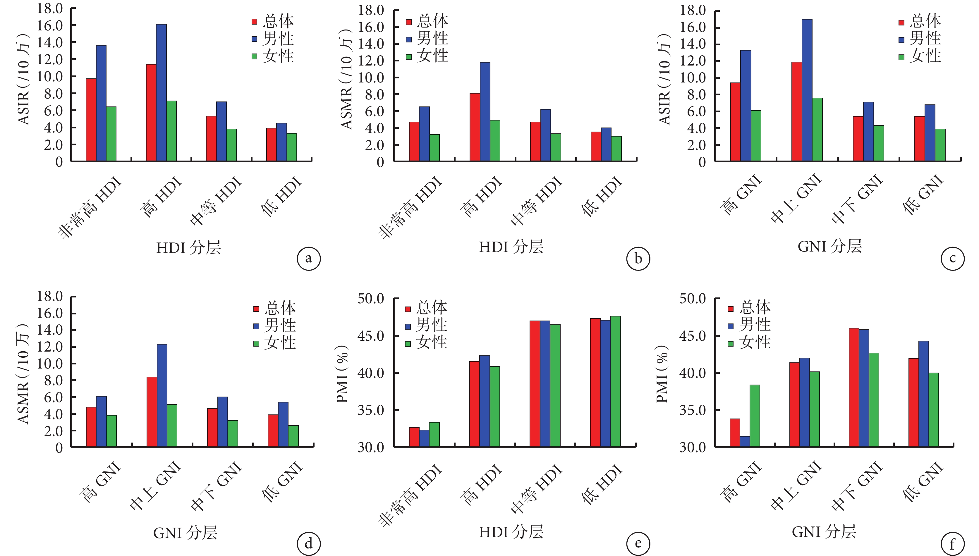 但評估PMI指標時,非常高HDI或高GNI國家/地區的PMI均低于其他分層國家/地區,表現最優(圖1e、1f),其中按HDI分層呈現梯度性差異。在非常高HDI、低HDI、高GNI國家/地區的女性胃癌PMI高于男性,特別是在高GNI國家/地區PMI的男女差異明顯。
