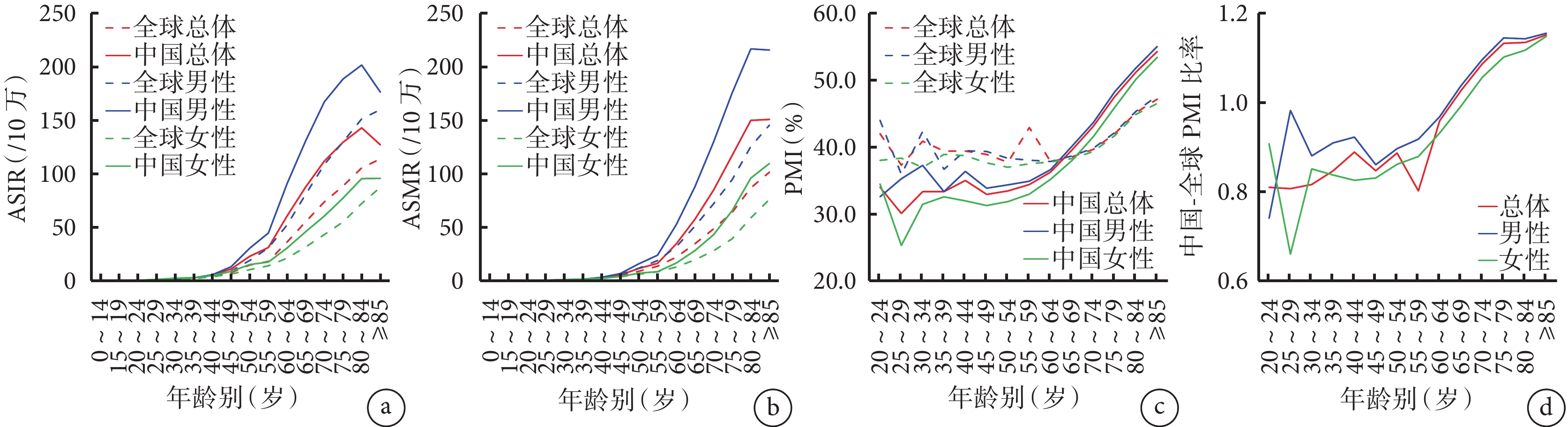 示全球及中國各年齡別總體、男性、女性的胃癌ASIR(a)、ASMR(b)、PMI(c)及中國-全球PMI比率(d)的折線圖